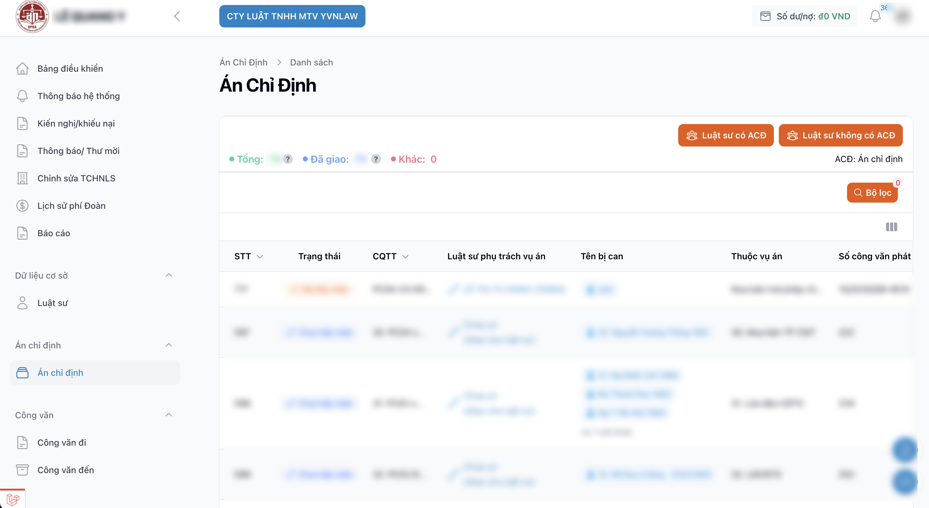 Hướng dẫn người dùng sử dụng chức năng [Án chỉ định - Án chỉ định] trong hệ thống quản lý của Đoàn Luật sư tỉnh Đồng Nai, cho phép bạn quản lý toàn bộ các vụ án trong hệ thống, bao gồm: