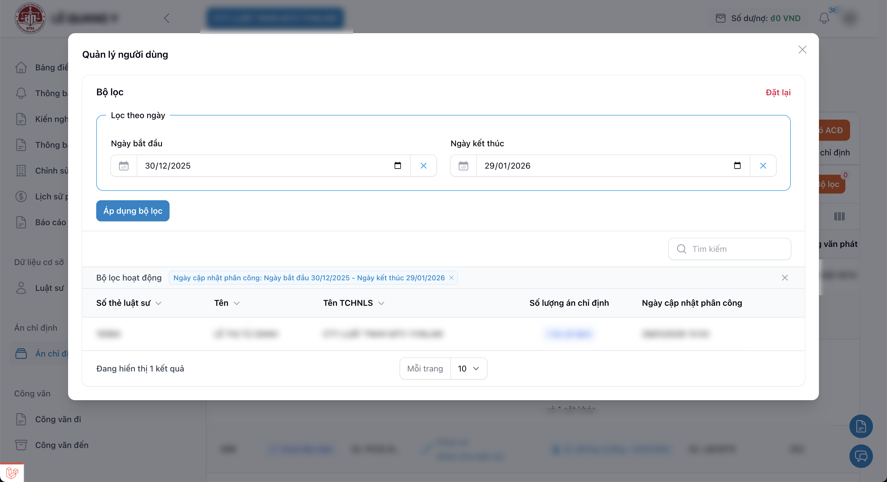 Mở cửa sổ popup hiển thị danh sách luật sư đang có ít nhất một án chỉ định (thuộc TCHNLS). Giúp tra cứu luật sư đang có án. |