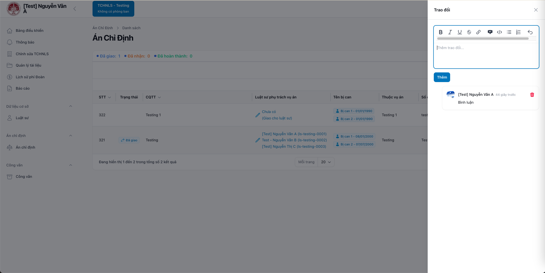 Hướng dẫn người dùng sử dụng chức năng [Án chỉ định - Án chỉ định] trong hệ thống quản lý của Đoàn Luật sư tỉnh Đồng Nai, bao gồm: