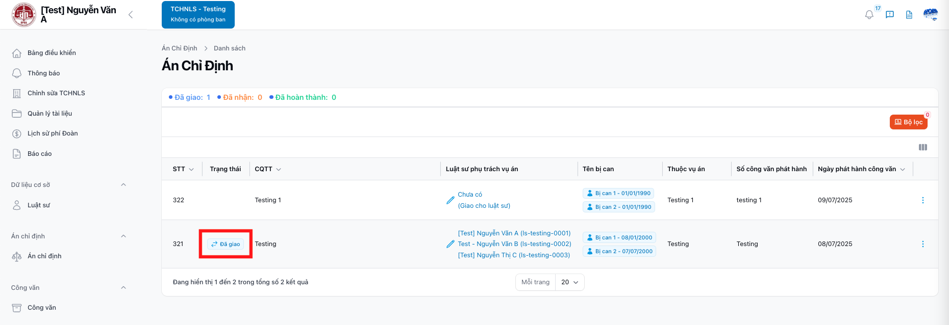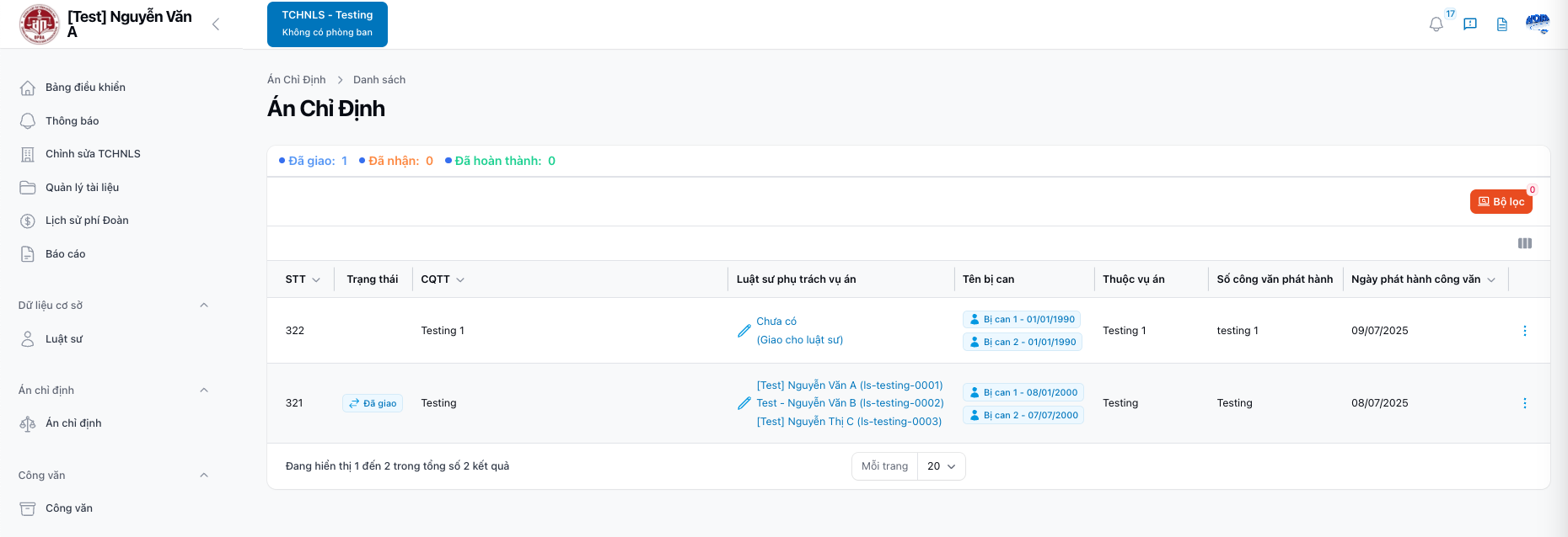 | B3 | Hệ thống hiển thị danh sách Án chỉ định | Có thể tìm theo Trạng thái, Tên TCHNLS, CQTT,... |