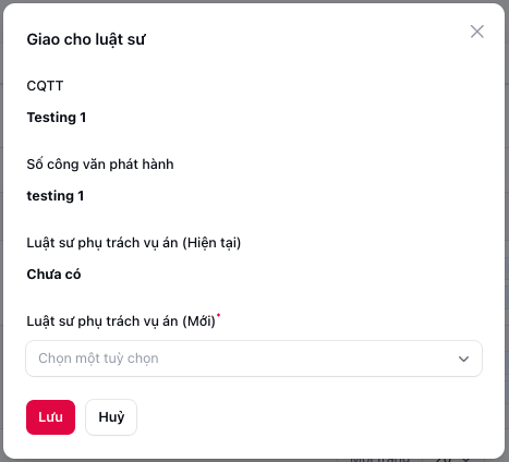 - Chỉ gán được khi vụ việc có thể sửa: Bạn chỉ có thể gán luật sư khi vụ việc ở trạng thái "Đã giao" hoặc "Đã nhận"