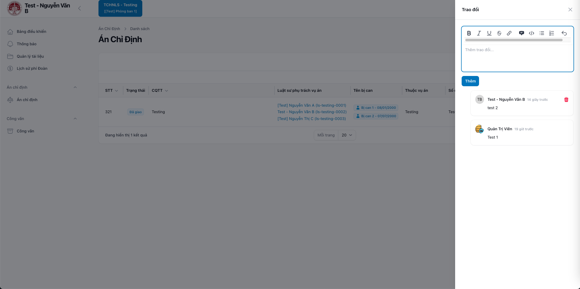 Hướng dẫn người dùng sử dụng chức năng [Án chỉ định - Án chỉ định] trong hệ thống quản lý của Đoàn Luật sư tỉnh Đồng Nai, bao gồm: