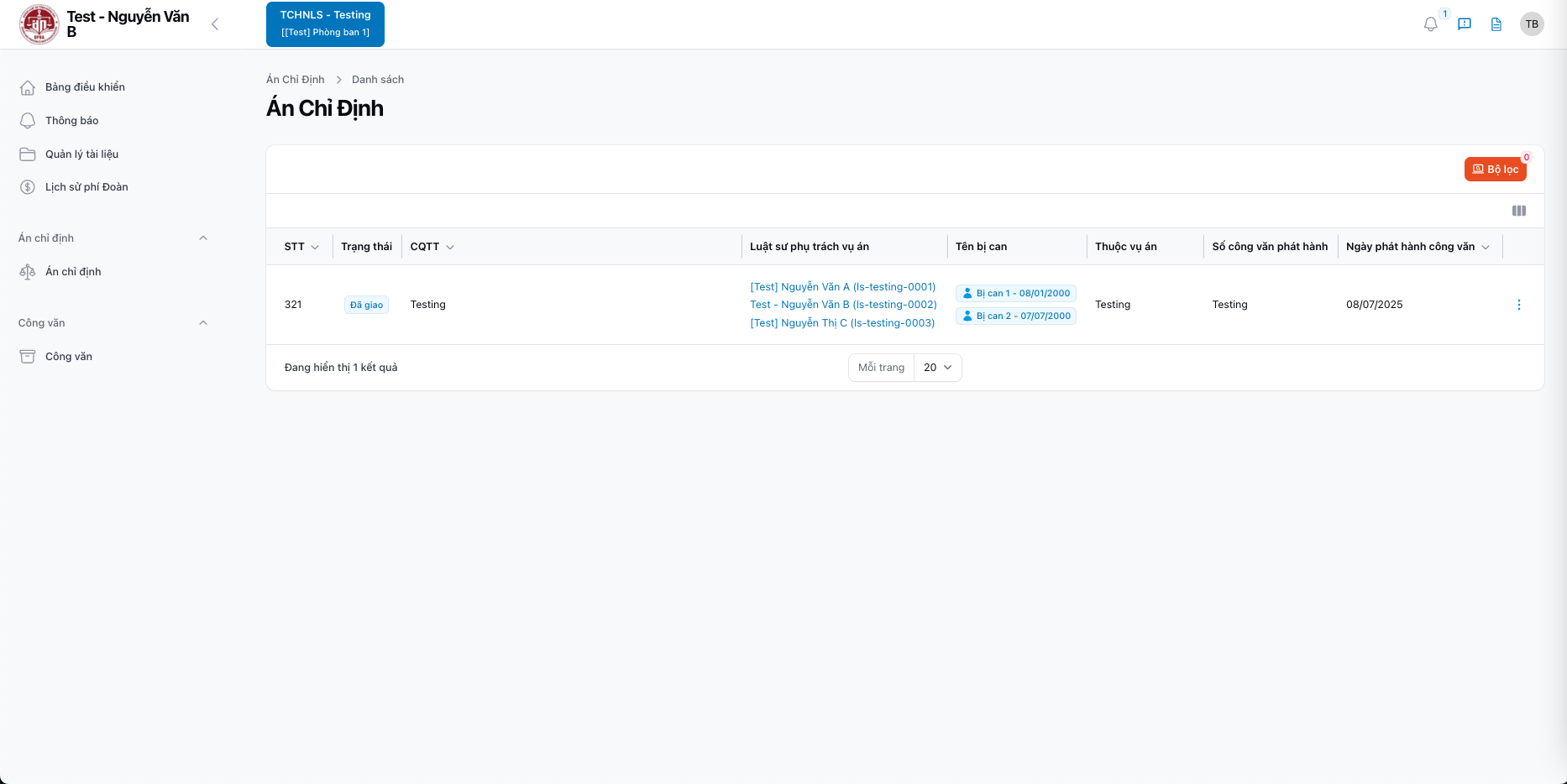 | B3 | Hệ thống hiển thị danh sách Án chỉ định | Có thể tìm theo Trạng thái, Tên TCHNLS, CQTT,... |