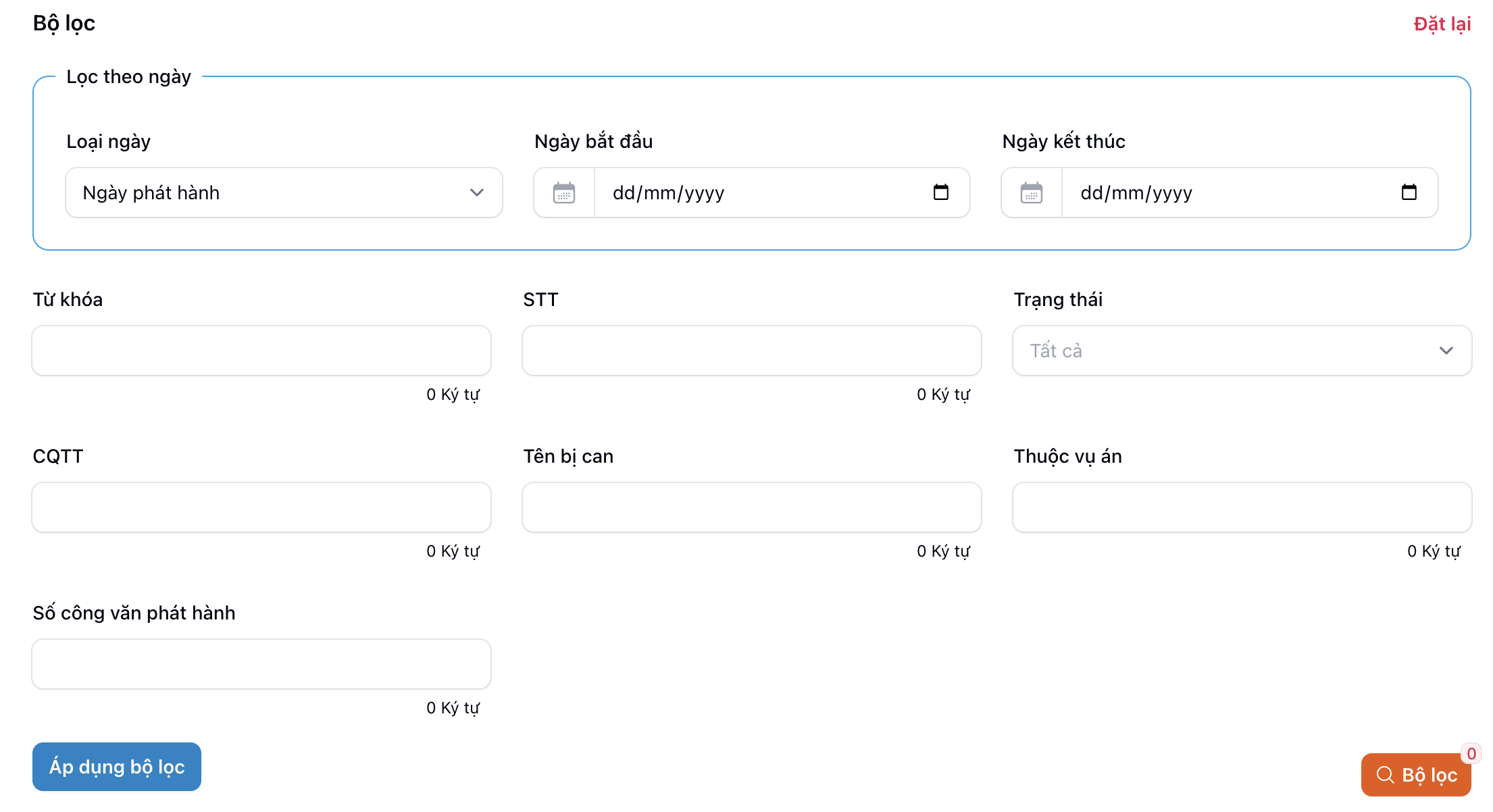 | B2 | Nhập từ khoá hoặc các thông tin cần tìm kiếm | Có thể tìm theo Trạng thái, CQTT, v.v. |