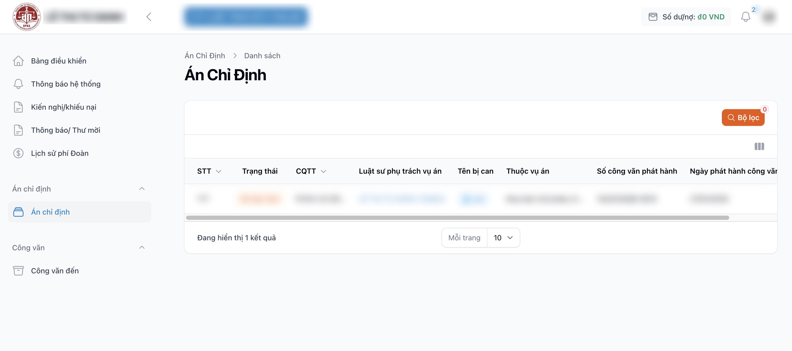 Hướng dẫn người dùng sử dụng chức năng [Án chỉ định - Án chỉ định] trong hệ thống quản lý của Đoàn Luật sư tỉnh Đồng Nai, cho phép bạn quản lý các vụ án trong hệ thống, bao gồm: