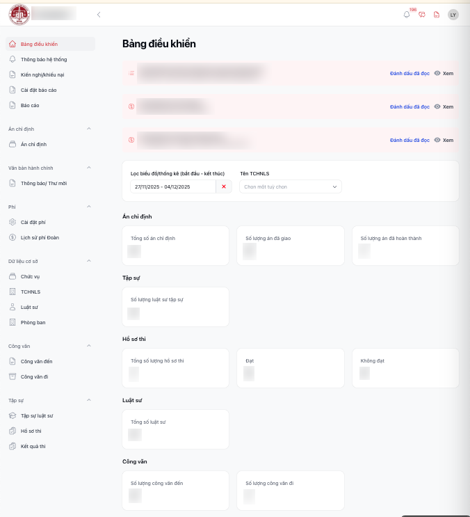 Trang Bảng điều khiển là giao diện tổng hợp số liệu thống kê của hệ thống, giúp người dùng theo dõi tình hình xử lý các công việc liên quan đến án chỉ định, tập sự luật sư, hồ sơ thi, công văn và các chỉ số khác. Đây là công cụ trực quan nhằm hỗ trợ quản lý và ra quyết định hiệu quả.