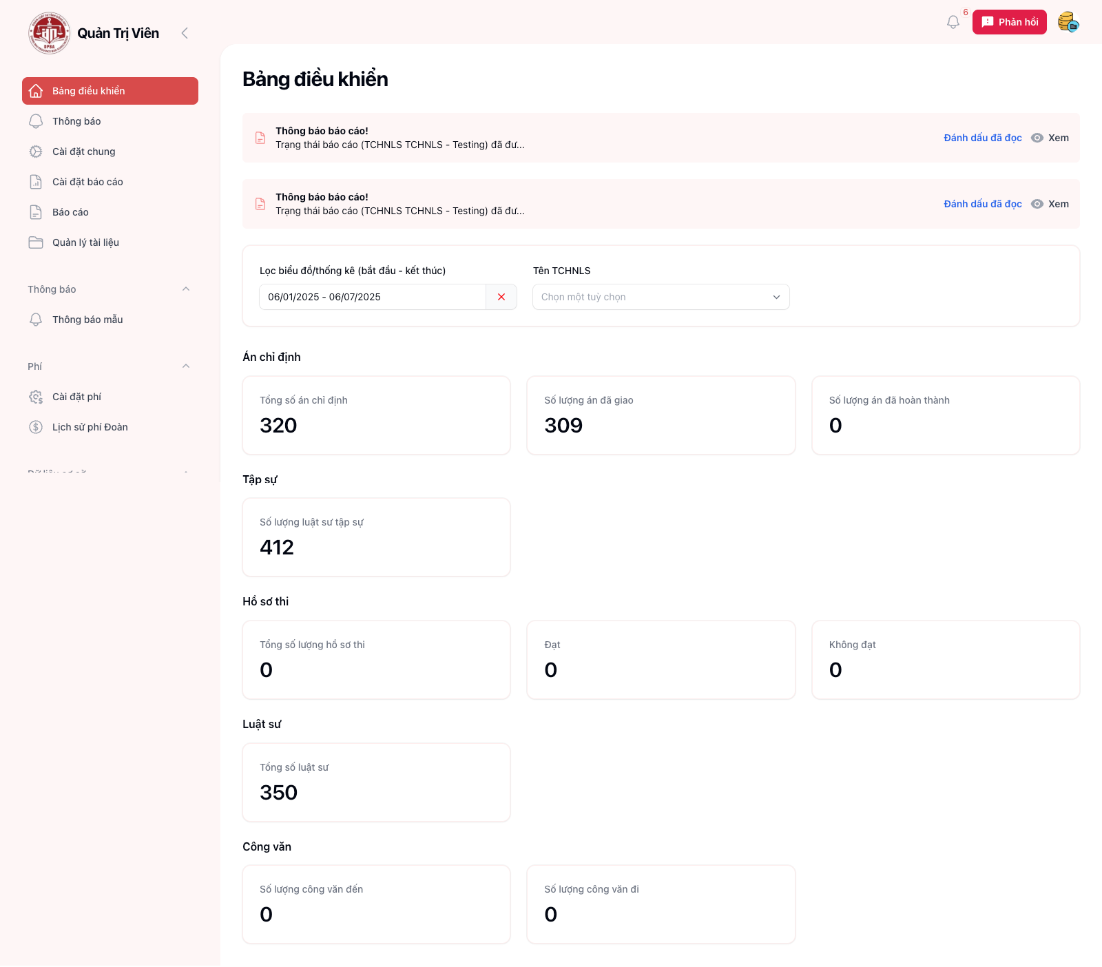 Trang Bảng điều khiển là giao diện tổng hợp số liệu thống kê của hệ thống, giúp người dùng theo dõi tình hình xử lý các công việc liên quan đến án chỉ định, tập sự luật sư, hồ sơ thi, công văn và các chỉ số khác. Đây là công cụ trực quan nhằm hỗ trợ quản lý và ra quyết định hiệu quả.