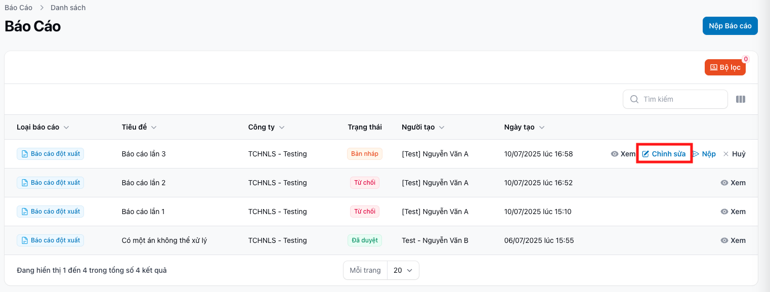 | B1 | Tìm báo cáo cần sửa | Dùng ô tìm kiếm trên danh sách |