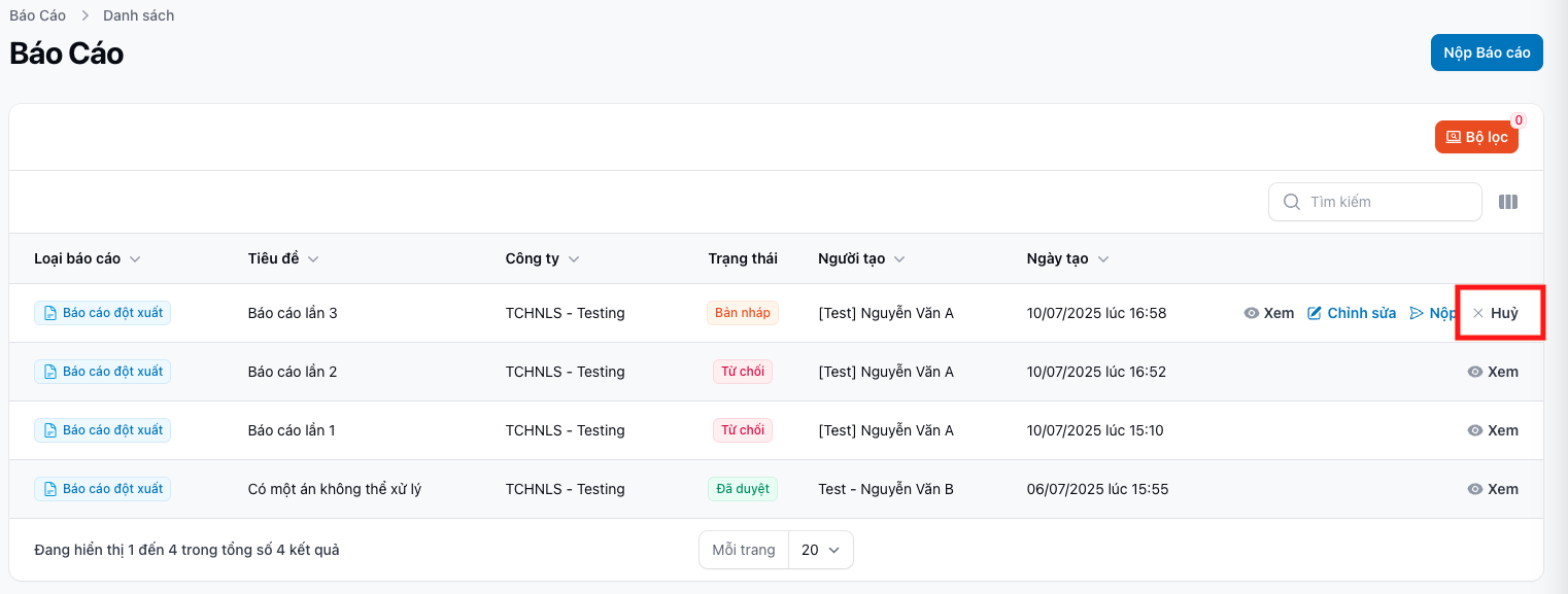 🔹 E. Hủy Báo cáo