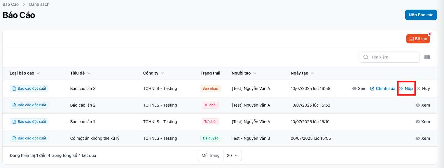| B2 | Nhấn vào nút Nộp | Ở trang "Danh sách" hoặc ở trang "Xem chi tiết" |