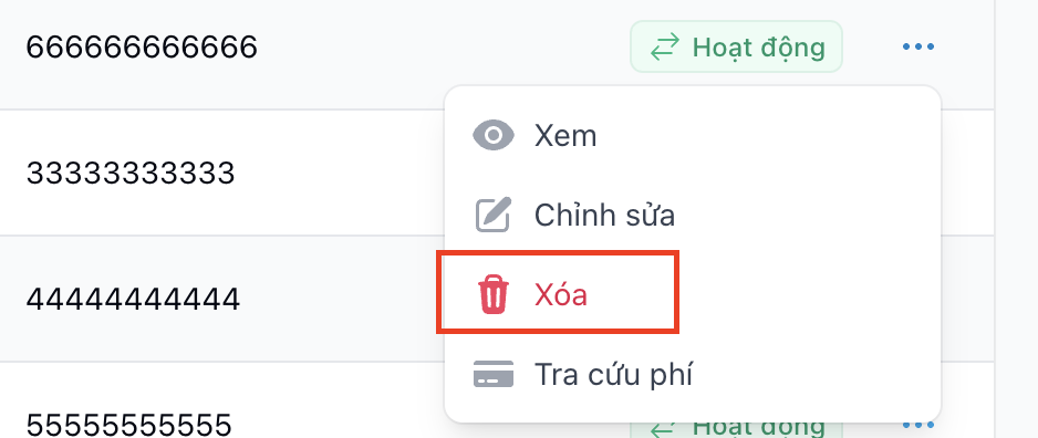 | B2 | Nhấn biểu tượng "Tra cứu phí" tại dòng cần xoá | |