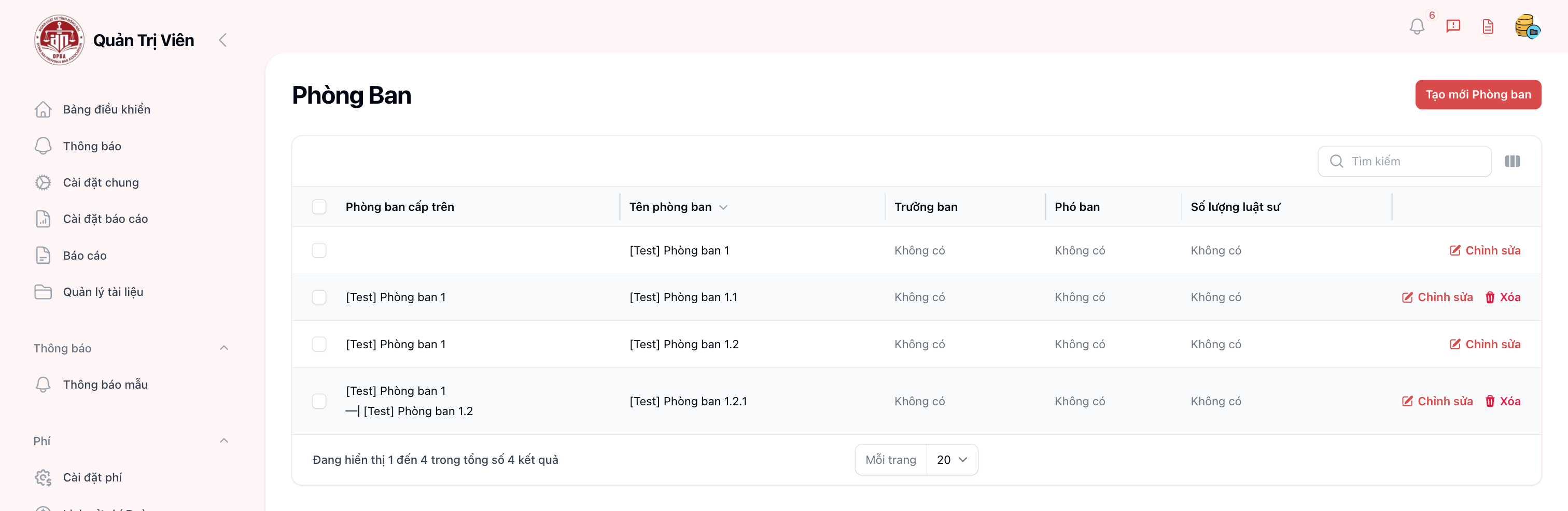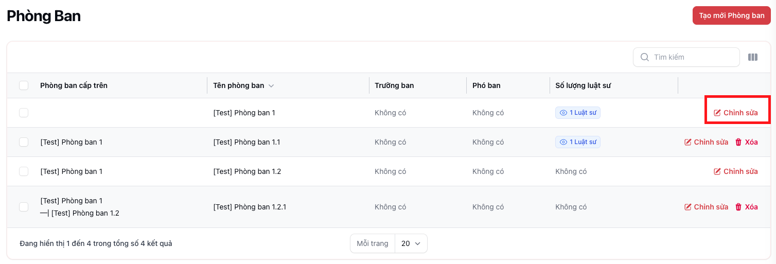 | B1 | Nhấn nút “Tạo mới Phòng ban” | Nằm ở góc trên bên phải danh sách |
