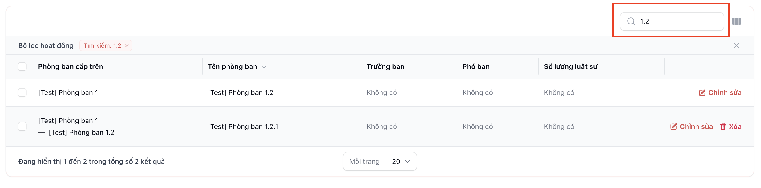 | B1 | Tìm kiếm "Phòng ban" cần xoá | |