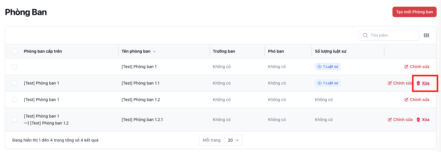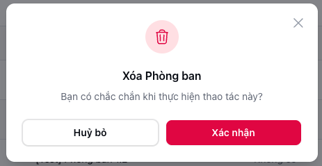 | B2 | Nhấn biểu tượng 🗑️ Xoá tại dòng cần xoá | Chỉ hiển thị nếu chưa thuộc Phòng ban cấp trên nào |