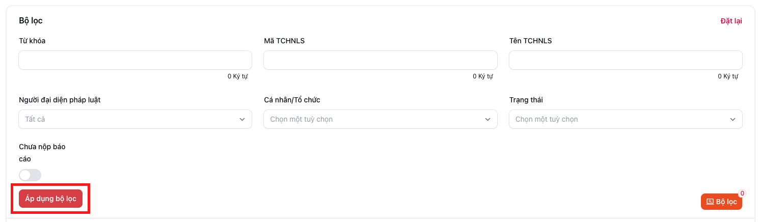 | B3 | Nhấn vào nút Áp dụng bộ lọc để lọc danh sách TCHNLS | |