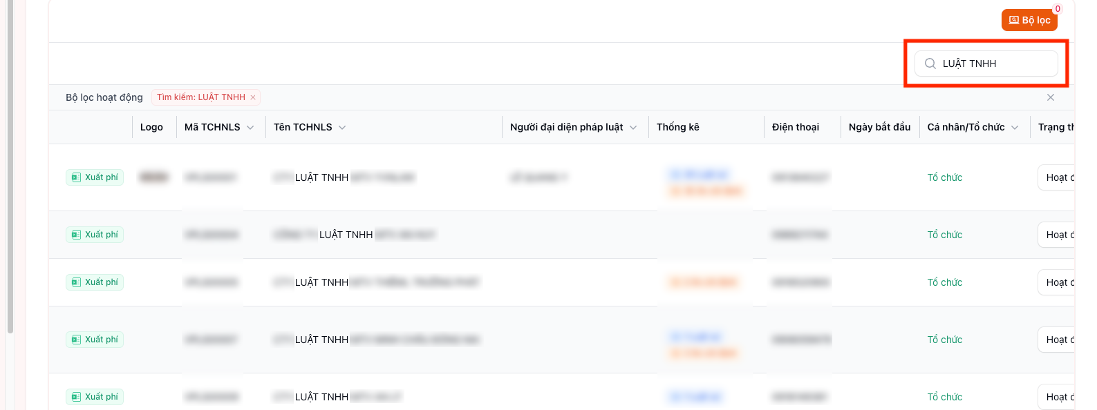 | B2 | Nhập từ khoá hoặc các thông tin cần tìm kiếm | Có thể tìm theo Mã TCHNLS, Tên TCHNLS, Người đại diện pháp luật,... |