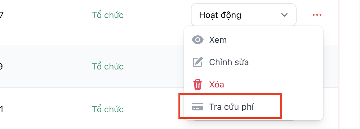 | B2 | Nhấn biểu tượng "Tra cứu phí" tại dòng | |