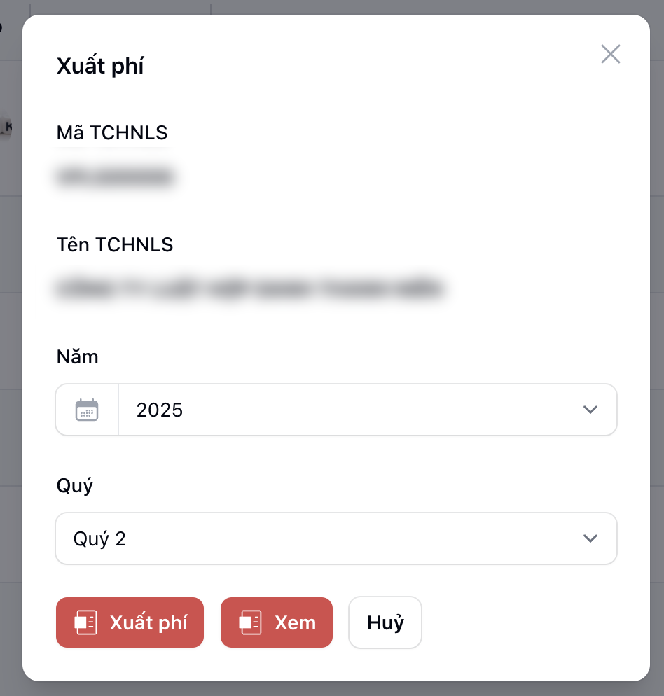| B3 | Hiện thị hộp thoại "Xuất phí" | Điền thông tin cần thiết (Năm, quý) |