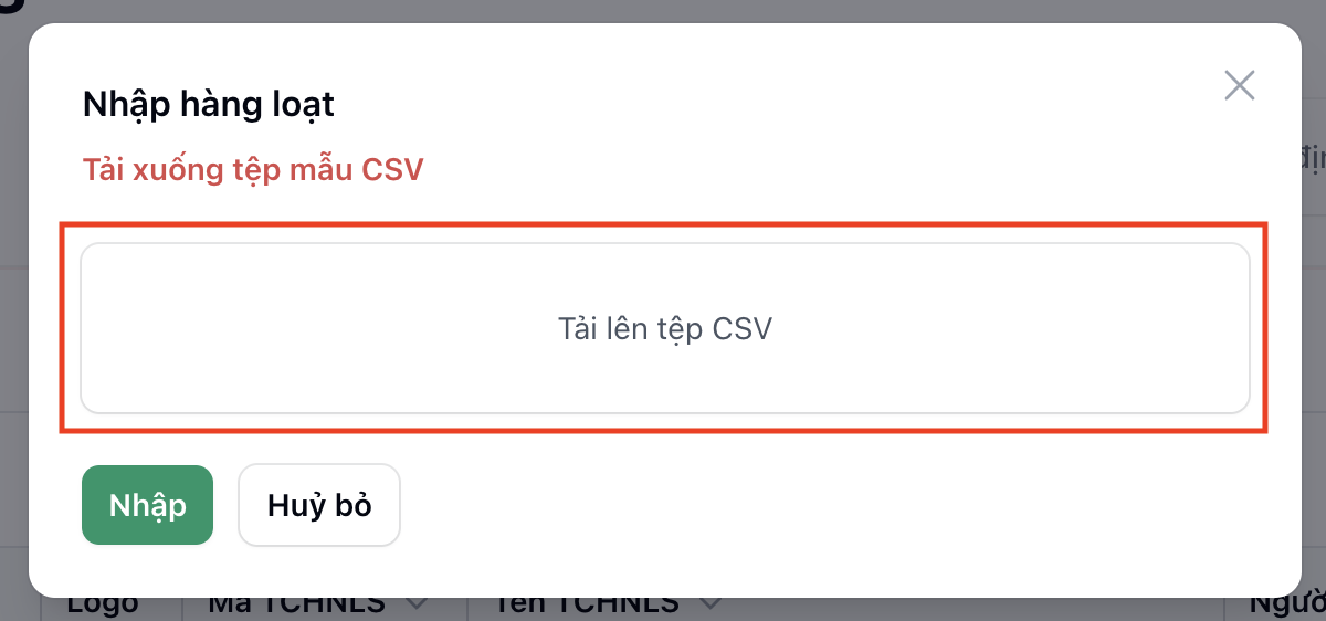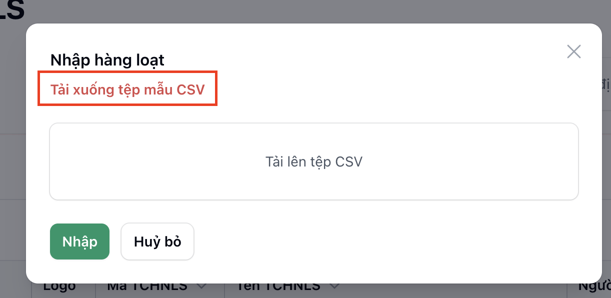 Tải tệp mẫu CSV (nếu chưa có): Để đảm bảo tệp của bạn có đúng định dạng, hãy tải về tệp mẫu CSV do hệ thống cung cấp. Tệp mẫu này sẽ chứa các tiêu đề cột đúng và thứ tự cần thiết. |