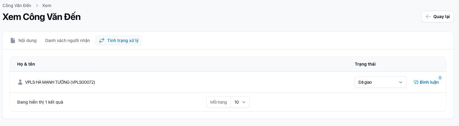 - Việc theo dõi tình trạng xử lý giúp bạn đảm bảo tất cả công văn được xử lý đúng hạn và không bị bỏ sót.