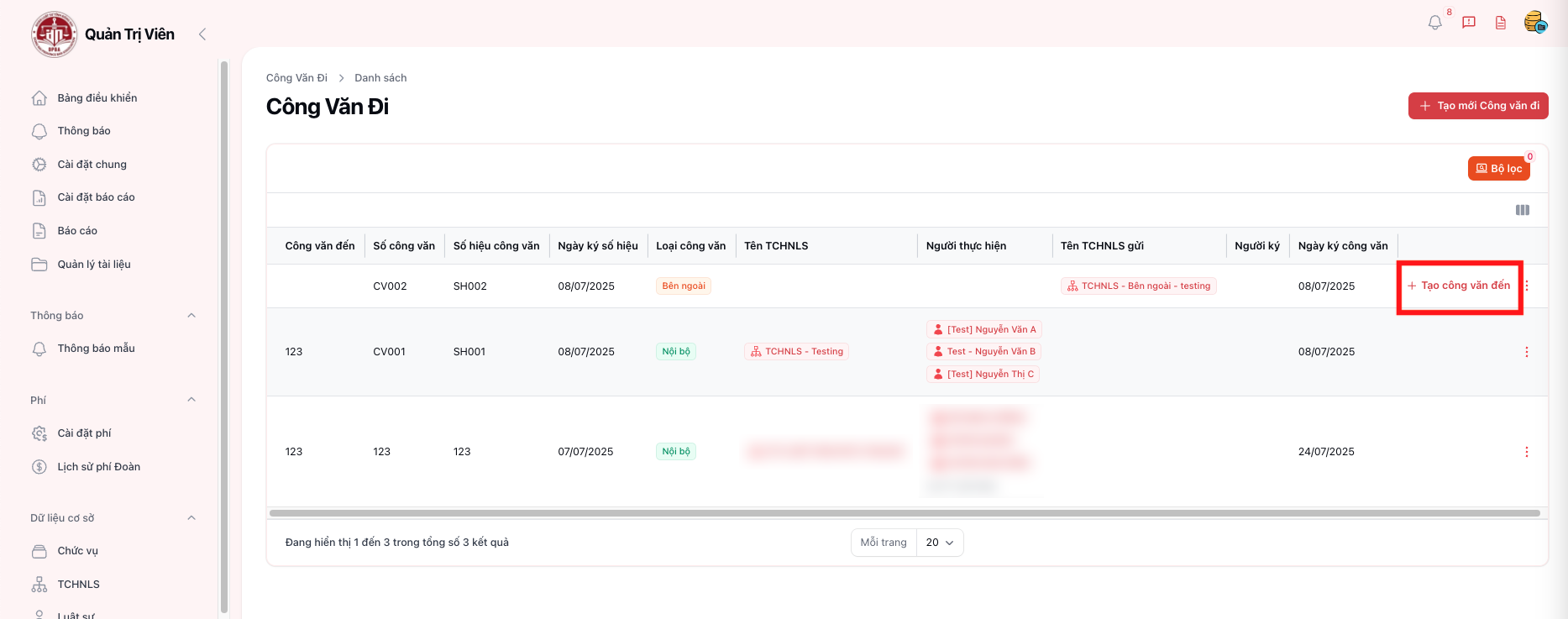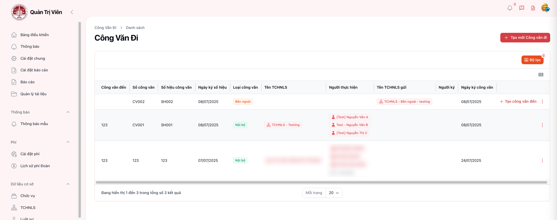 | B3 | Hệ thống hiển thị danh sách Công văn đi | Có thể tìm theo Công văn đi, Số công văn, Số hiệu công văn,... |
