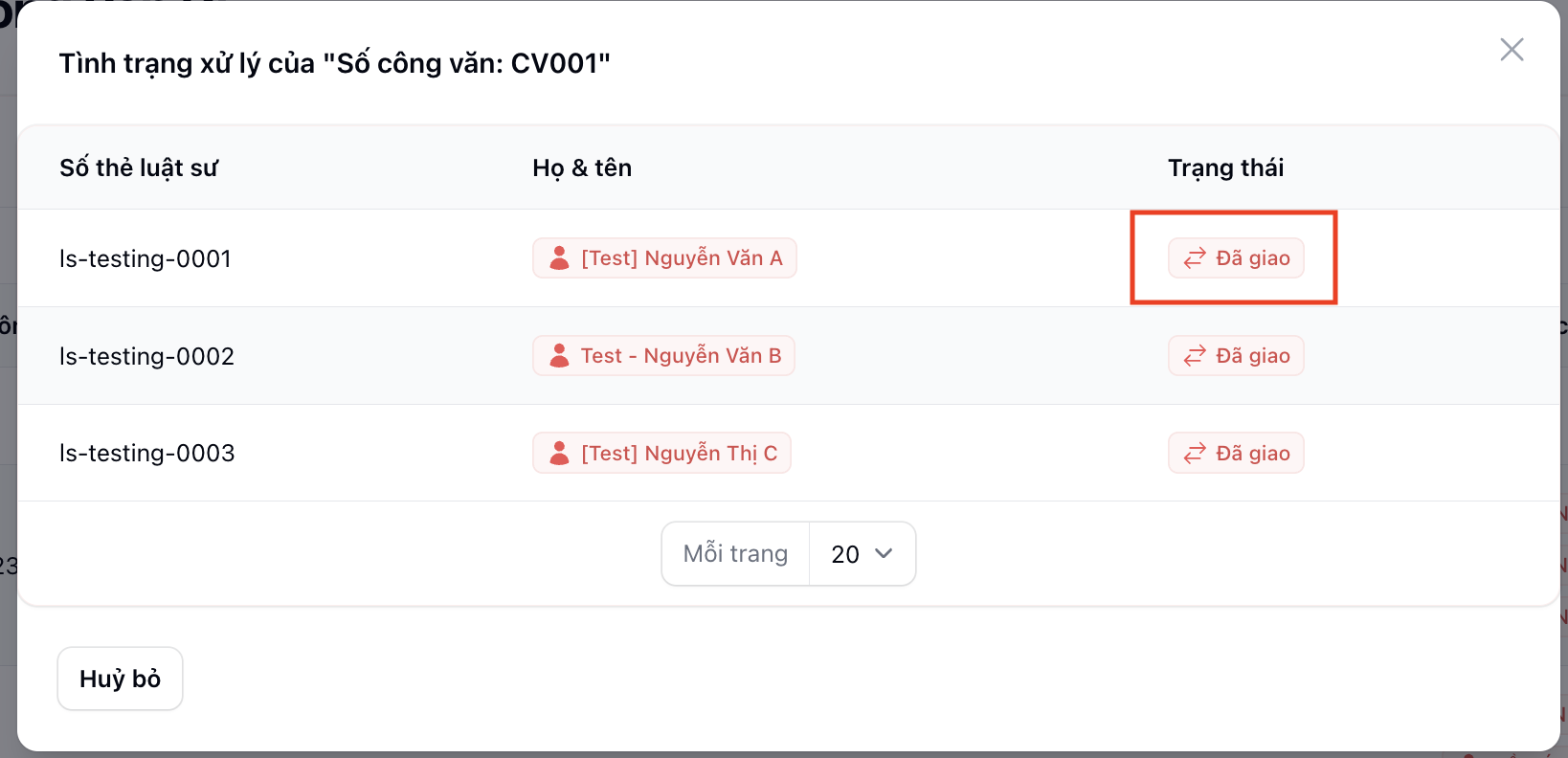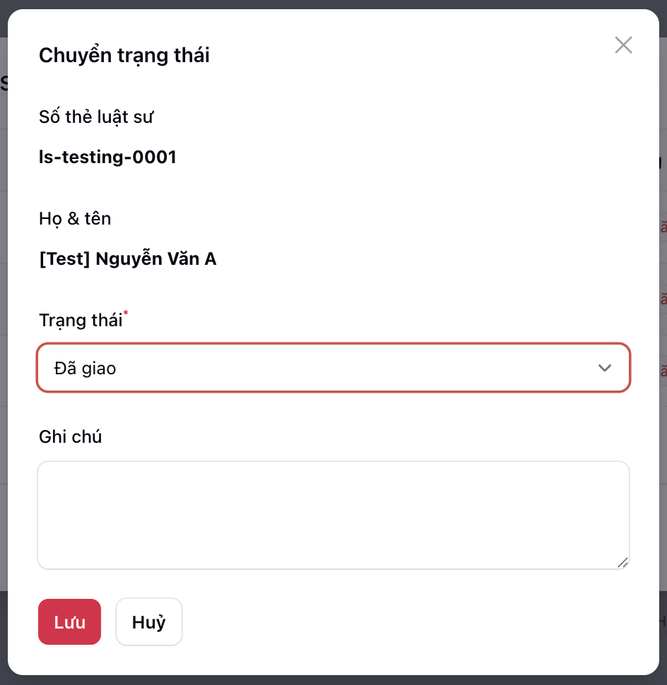 | Có thể chuyển đổi trạng thái của từng "Người thực hiện" | Trạng thái chỉ được chọn "Chưa hoạt động", "Đã giao" và "Đã hủy" |