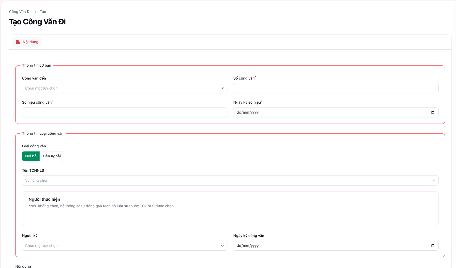- Khi tạo công văn đi, bạn phải chọn ít nhất một đối tượng nhận (TCHNLS/luật sư hoặc liên hệ bên ngoài)