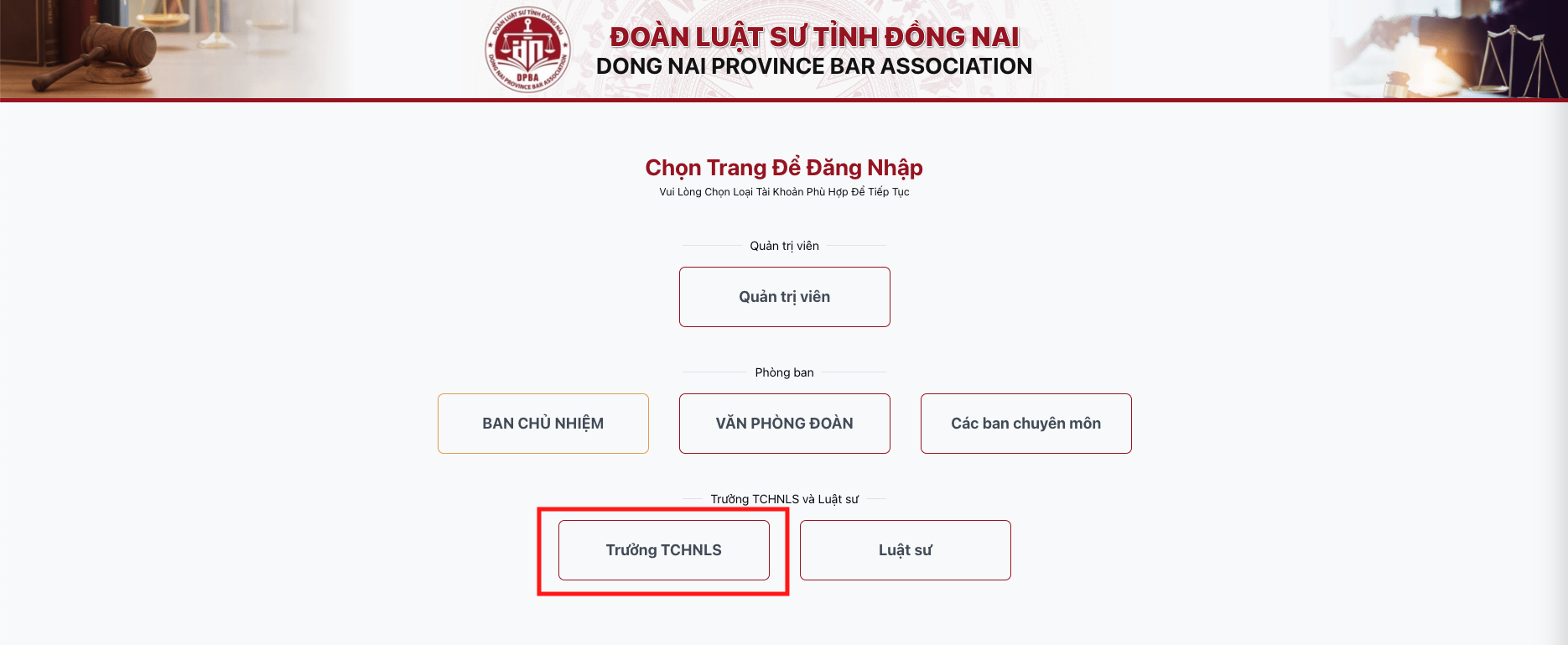 Khi truy cập vào hệ thống quản lý trực tuyến của Đoàn Luật sư tỉnh Đồng Nai, bạn sẽ được yêu cầu chọn loại tài khoản phù hợp để tiếp tục. Với vai trò là Trường TCHNLS, vui lòng làm theo các bước sau: