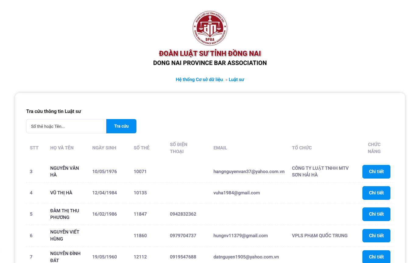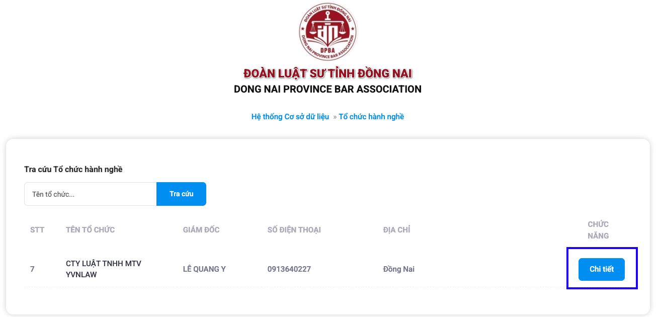 Hoặc ở cột "CHỨC NĂNG": bấm nút "Chi tiết" để mở trang chi tiết Luật sư.