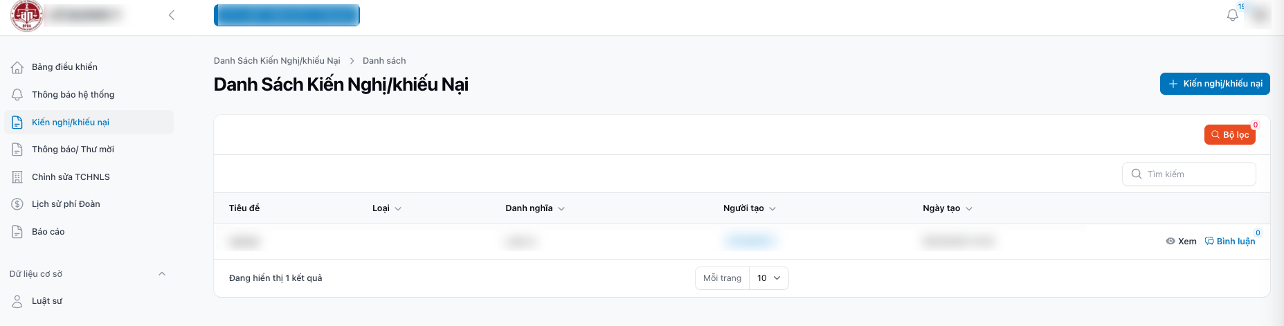 Hướng dẫn người dùng sử dụng chức năng [Kiến nghị / Khiếu nại] trong hệ thống quản lý của Đoàn Luật sư tỉnh Đồng Nai
