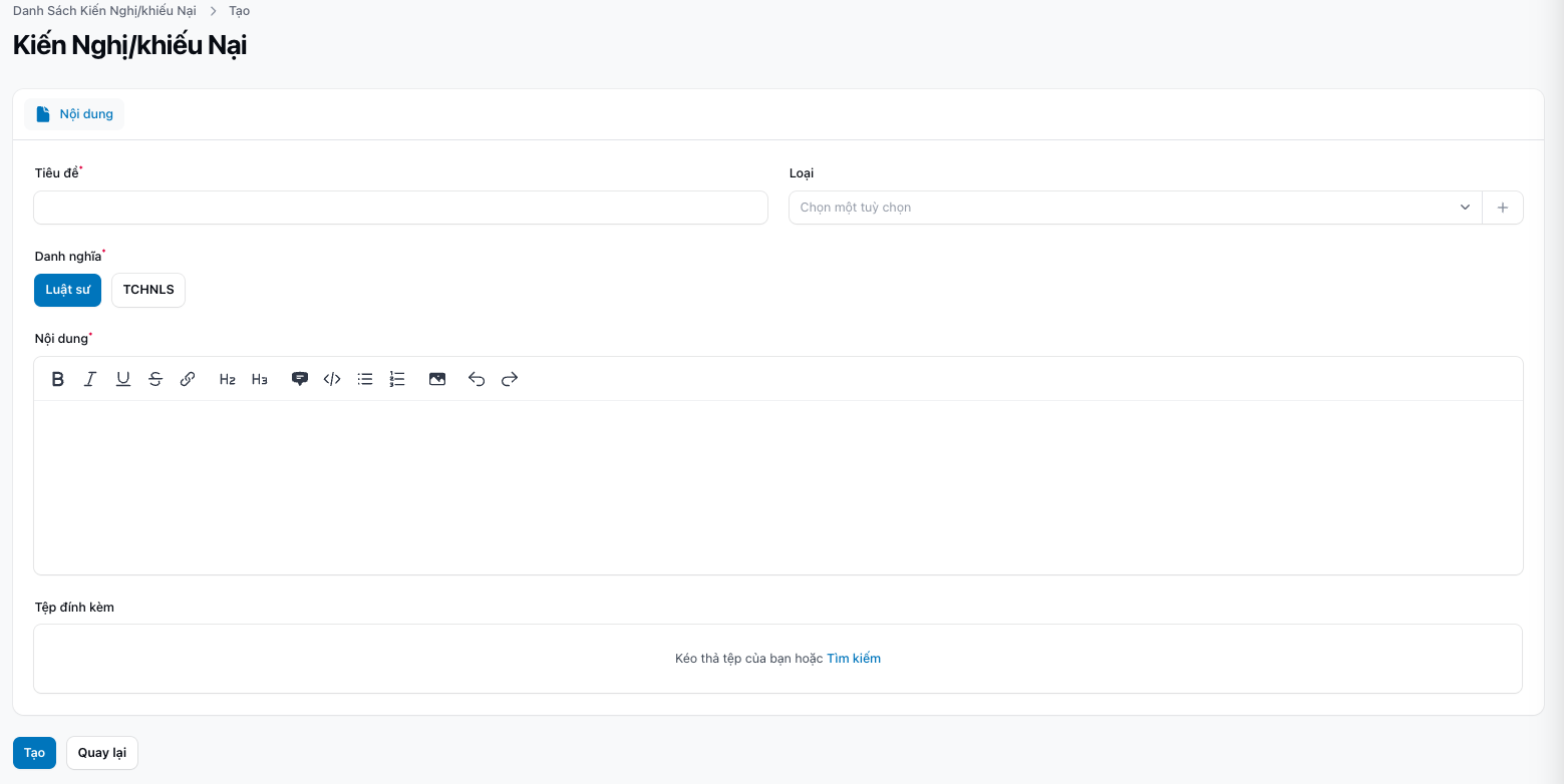 - Khi tạo kiến nghị/khiếu nại, bạn có thể chọn gửi với danh nghĩa "Luật sư" (cá nhân) hoặc "TCHNLS" (đại diện TCHNLS)