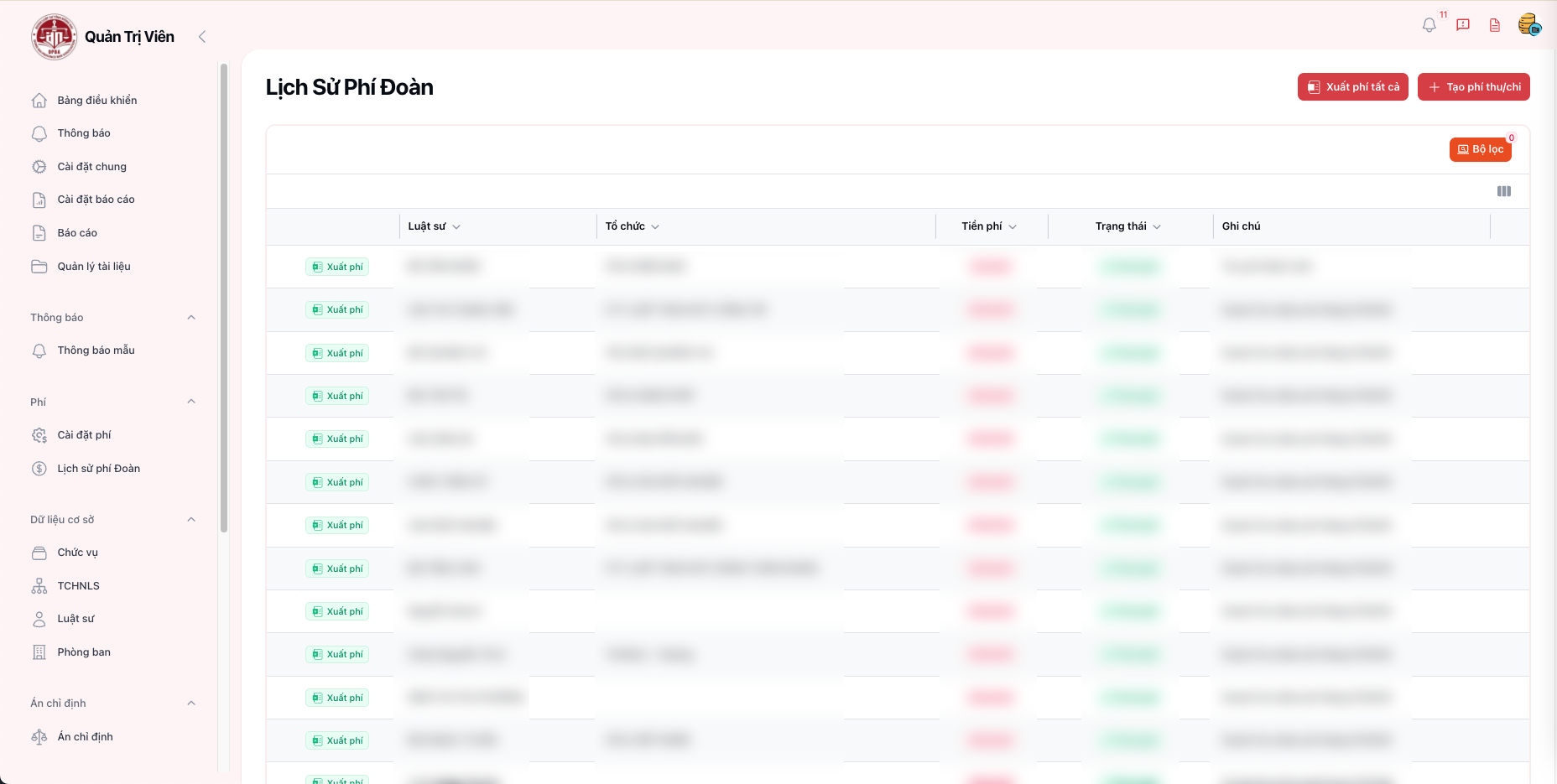 | B3 | Nhấn vào nút Áp dụng bộ lọc để lọc danh sách Lịch Sử Phí Đoàn | |