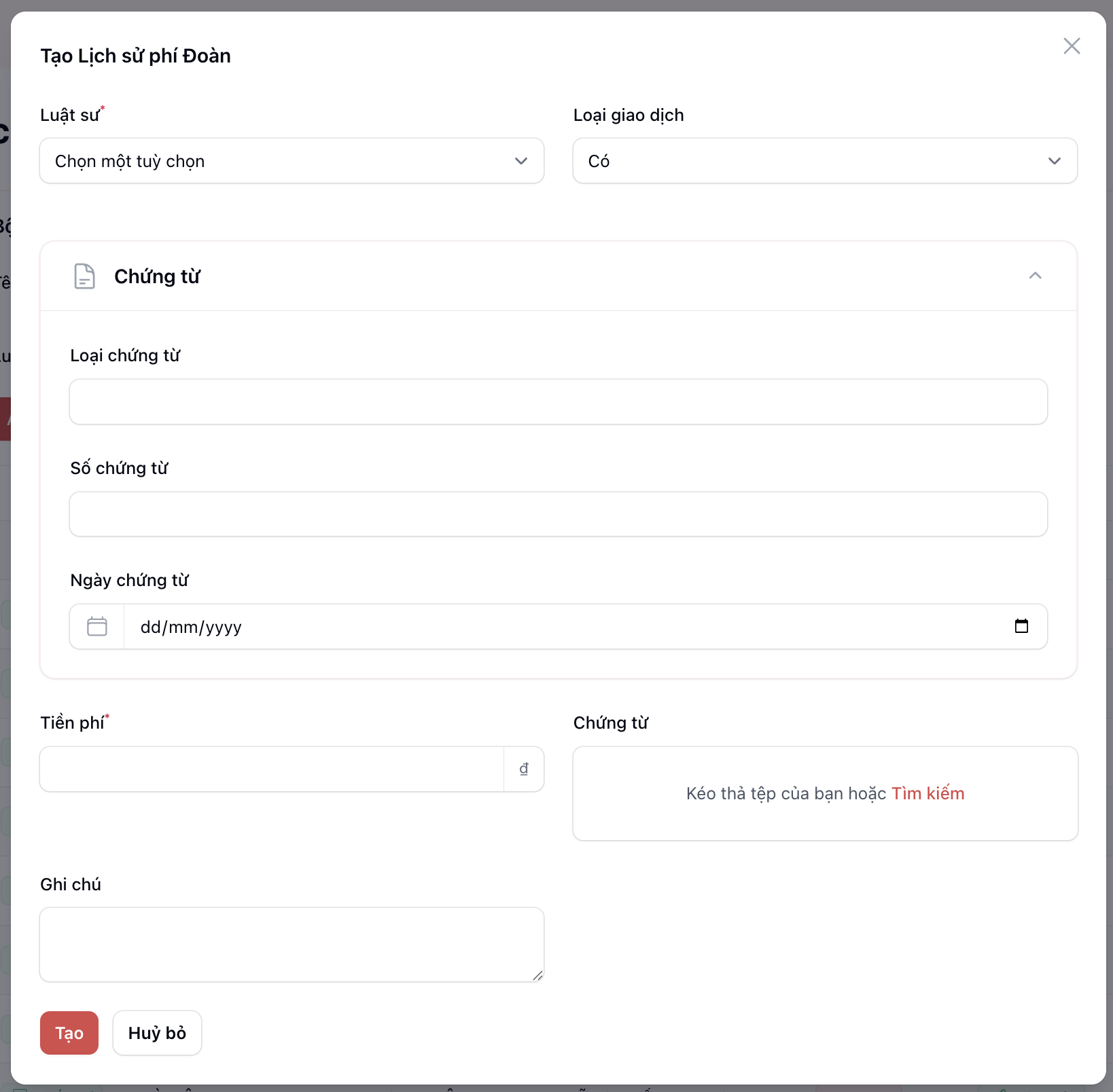 Nhập thông tin Luật sư, Loại giao dịch, chứng từ, v.v. |