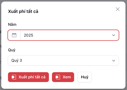 | B2 | Hiện thị hộp thoại "Xuất phí tất cả" | Điền thông tin cần thiết (Năm, quý) |