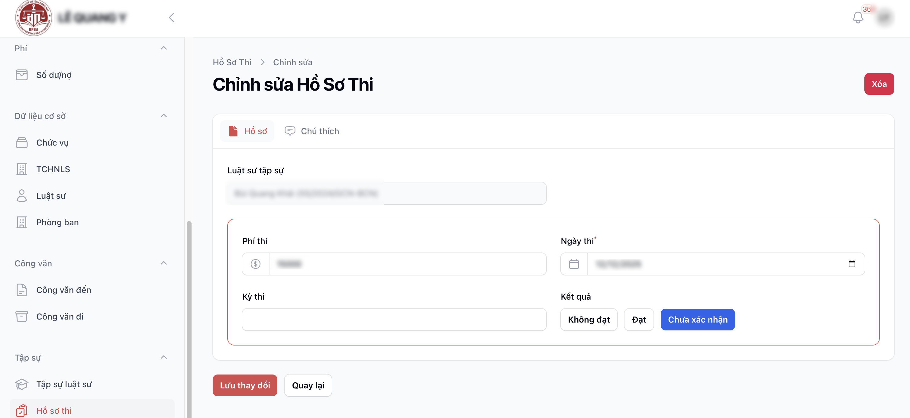 Hướng dẫn người dùng sử dụng chức năng [Tập sự - Hồ sơ thi] trong hệ thống quản lý của Đoàn Luật sư tỉnh Đồng Nai, bao gồm: