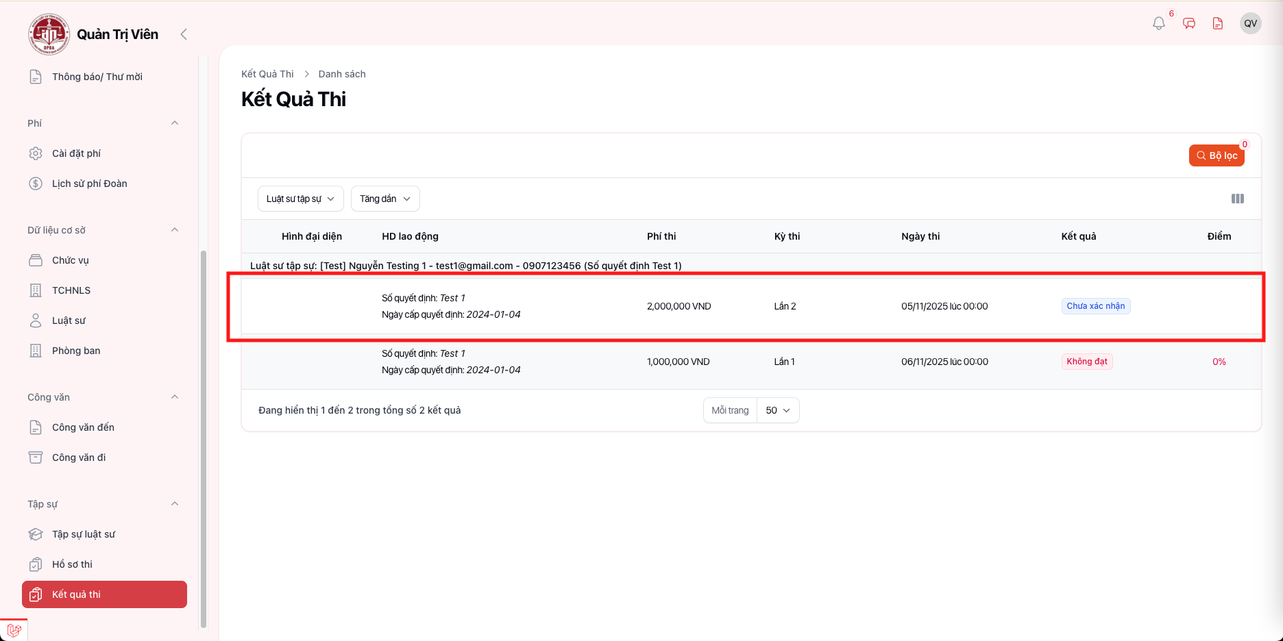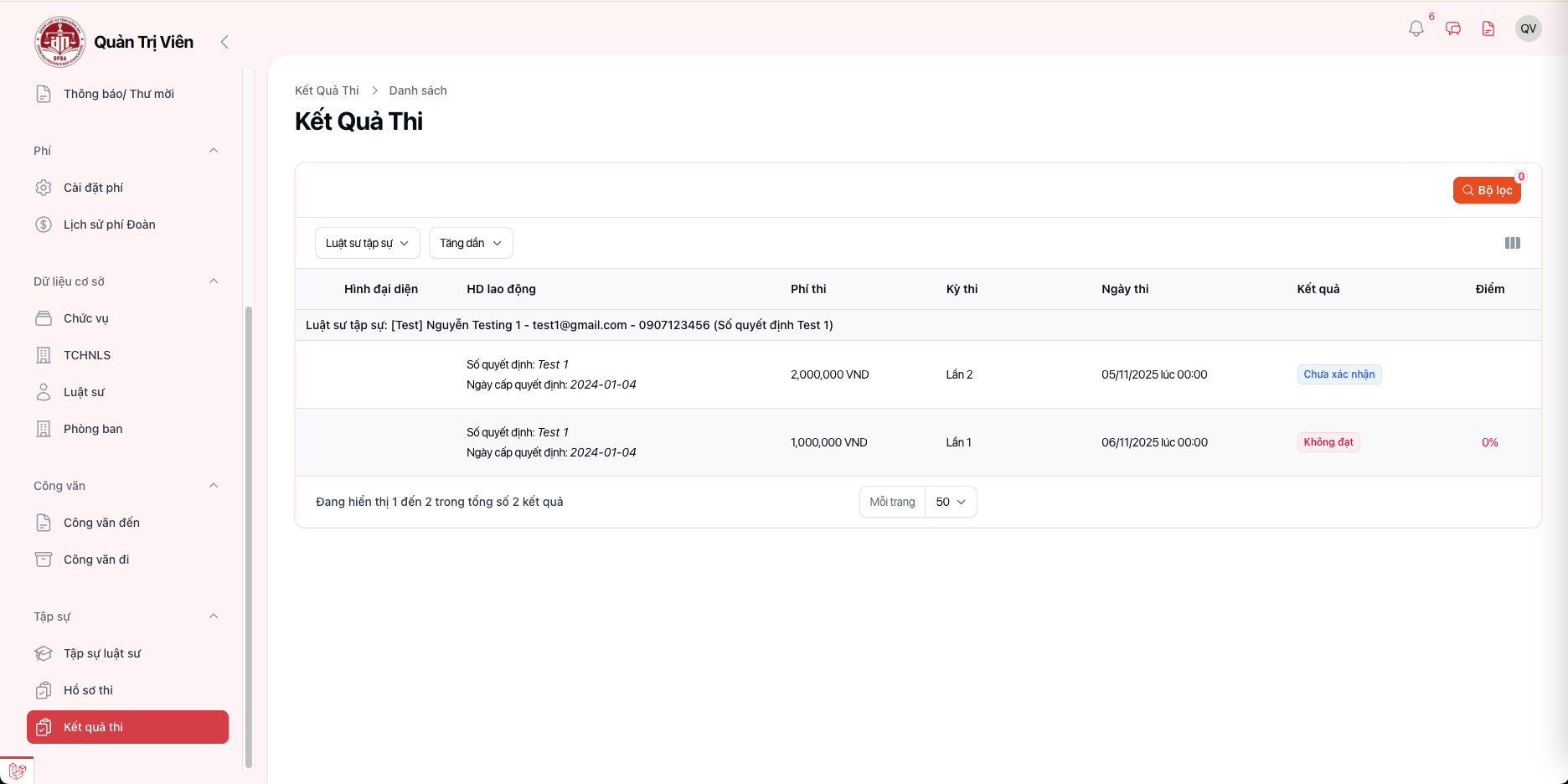 | B2 | Vào menu Tập sự > Kết quả thi | |