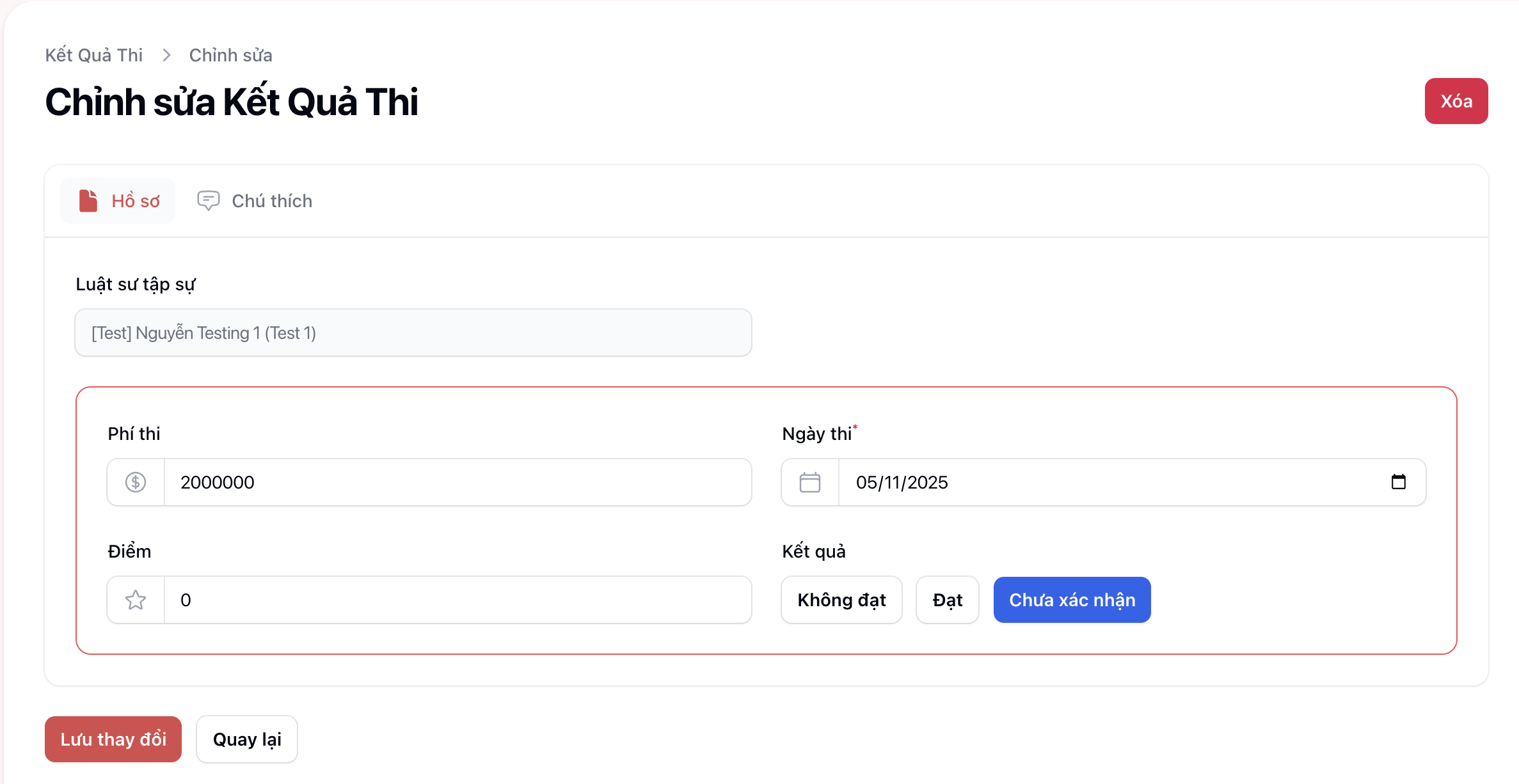 - Chỉ chỉnh sửa khi kết quả Chưa xác nhận - Kết quả chỉ chỉnh sửa 1 lần thành Không đạt hoặc Đạt |