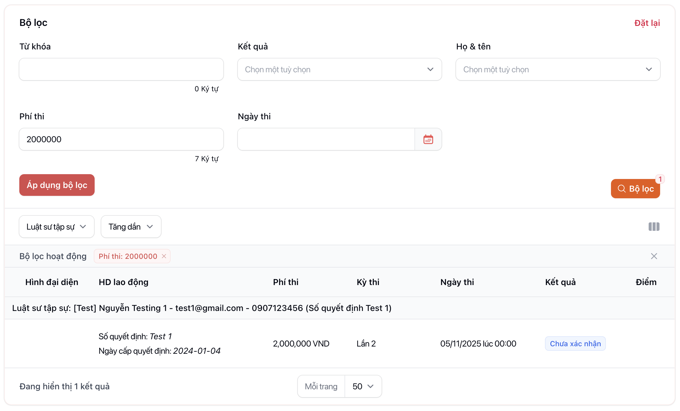 | B3 | Nhấn vào nút Áp dụng bộ lọc để lọc danh sách Hồ sơ thi | |