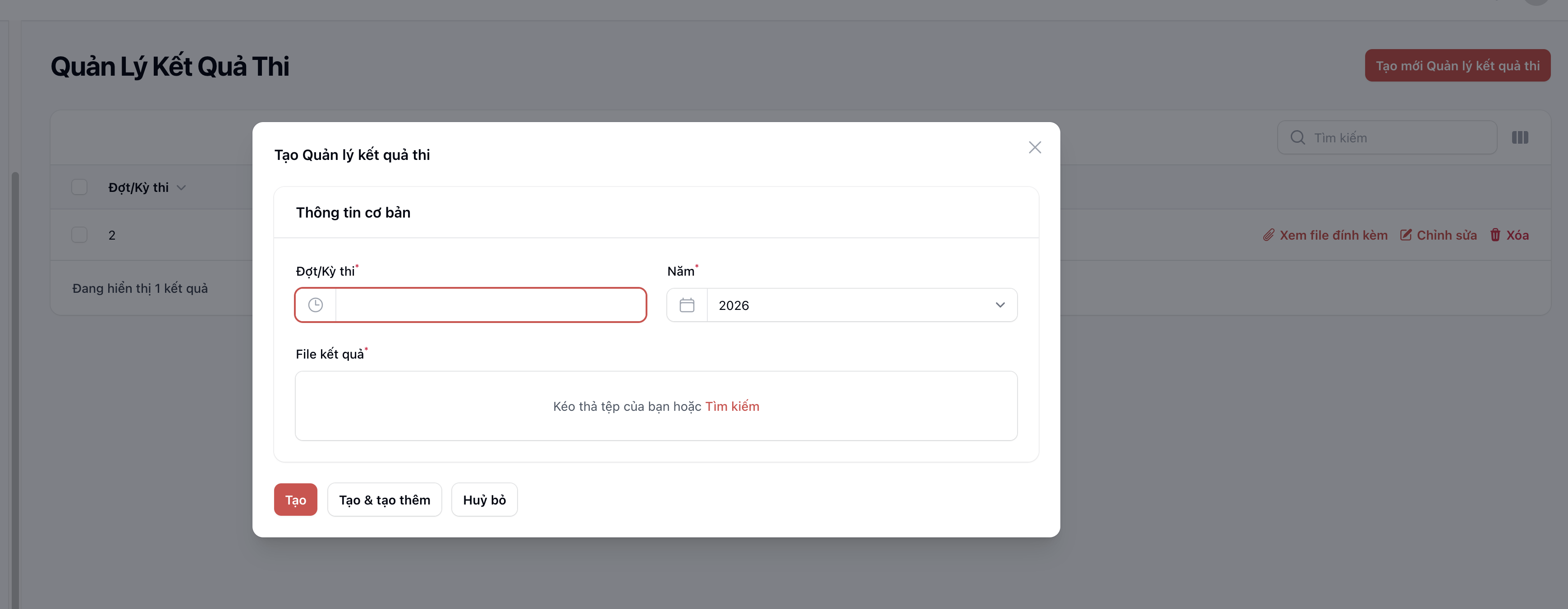 | B2 | Nhập từ khoá hoặc các thông tin cần tìm kiếm | Có thể tìm theo Kết quả, Họ & tên, Phí thi, ... |