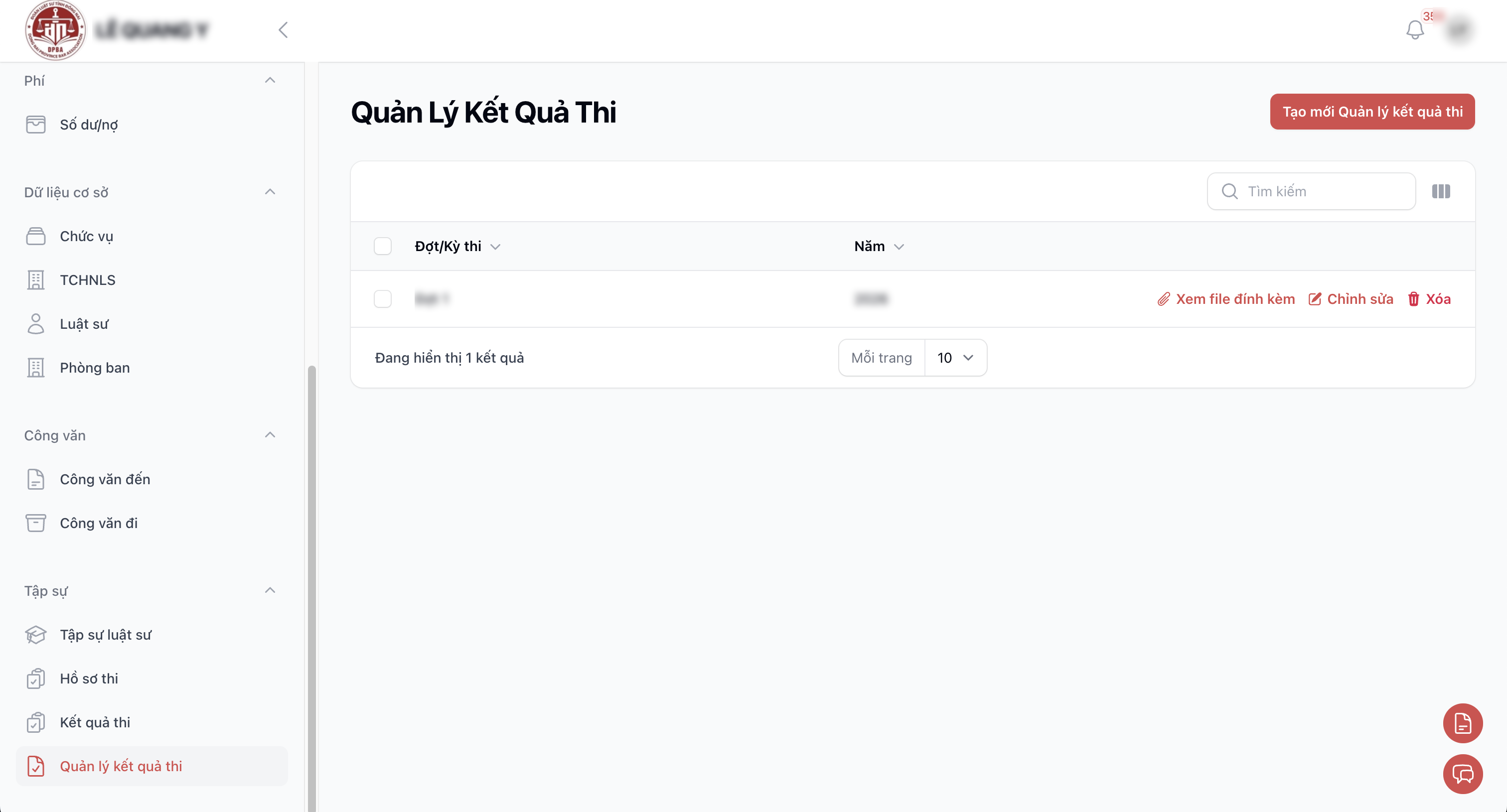 Hướng dẫn người dùng sử dụng chức năng [Tập sự - Quản lý Kết quả thi] trong hệ thống quản lý của Đoàn Luật sư tỉnh Đồng Nai, bao gồm: