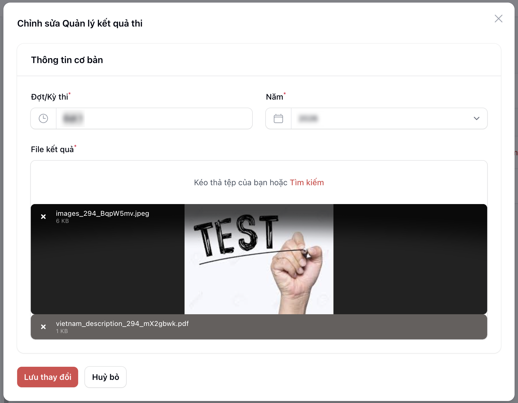- (Kỳ thi): gõ tên/tiêu đề (bắt buộc) - (Năm): chọn năm từ danh sách (mặc định hiện năm hiện tại) - (Tệp đính kèm): nhấn chọn file để tải lên. Hệ thống cho phép chọn nhiều file cùng lúc.