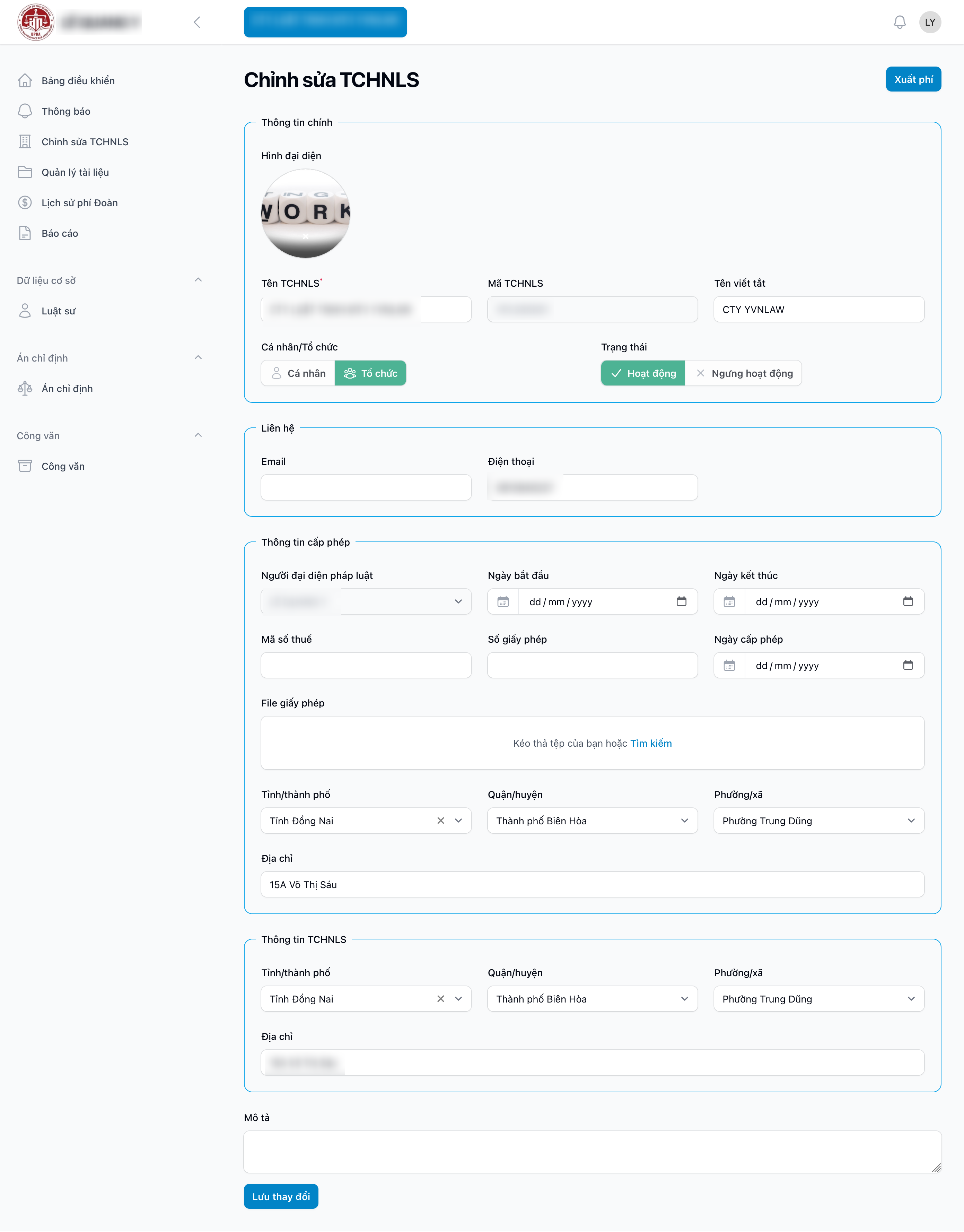 Chức năng này áp dụng cho: Trưởng TCHNLS hoặc Luật sư có vai trò quản lý của TCHNLS