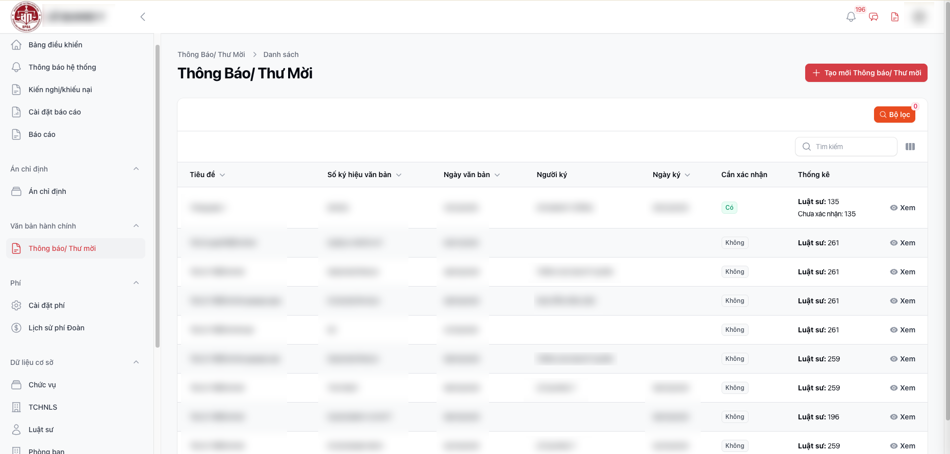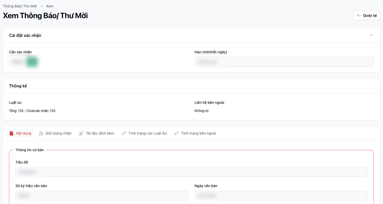 - Luật sư: Chỉ xem được các Thông Báo/ Thư Mời được gửi cho mình