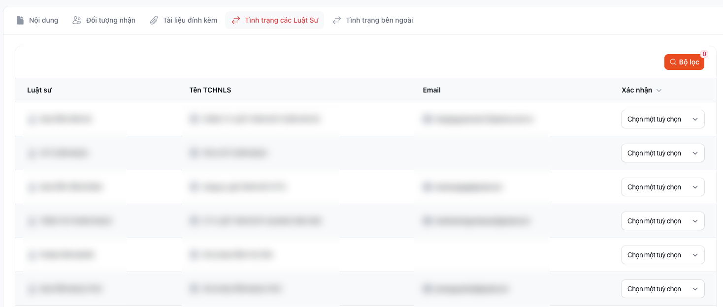 - Luật sư: Chỉ xem được các Thông Báo/ Thư Mời được gửi cho mình. Có thể xác nhận đã nhận Thông Báo/ Thư Mời.
